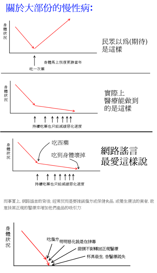 3 而事實上, 網路謠言的背後, 經常反而是要推銷偏方或保健食品, 或養生療法的業者, 故意抺黑正規的醫療來增加他們產品的吸引力:
