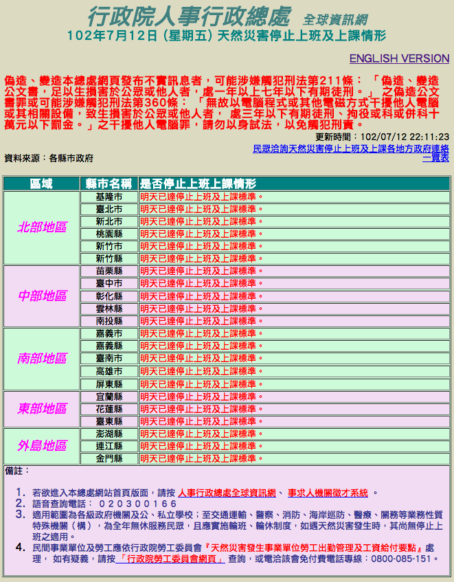 ⬅ 回看原文: [行政院] 停班停課公告網頁 (颱風假)