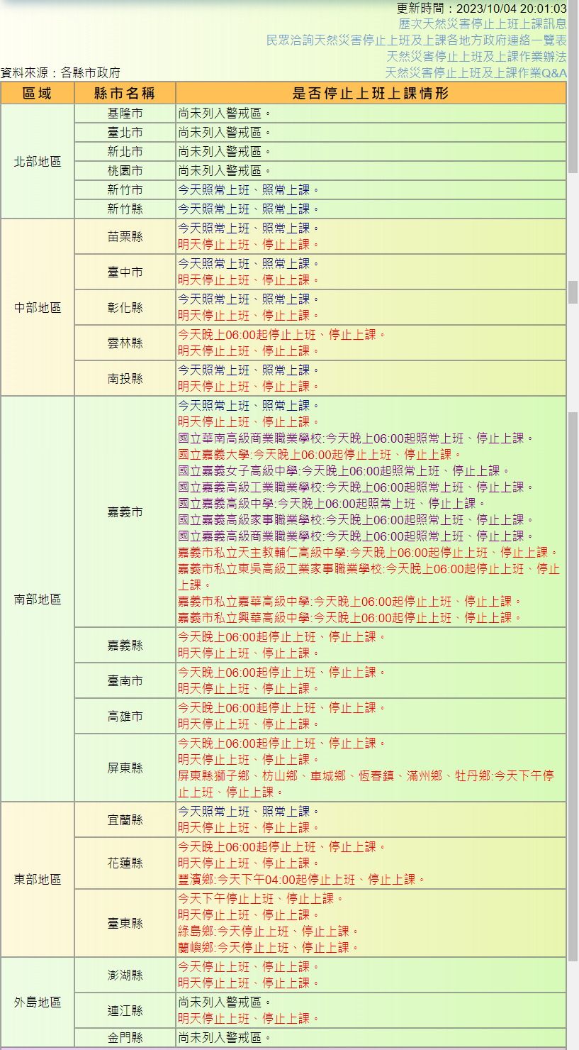 ⬅ 回看原文: [行政院] 停班停課公告網頁 (颱風假)