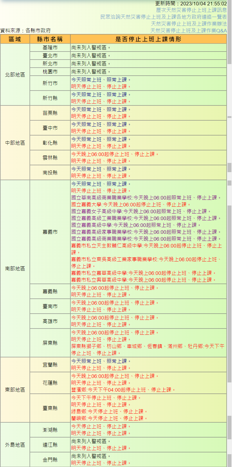 ⬅ 回看原文: [行政院] 停班停課公告網頁 (颱風假)
