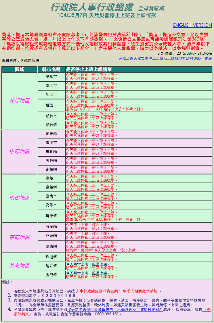 ⬅ 回看原文: [行政院] 停班停課公告網頁 (颱風假)