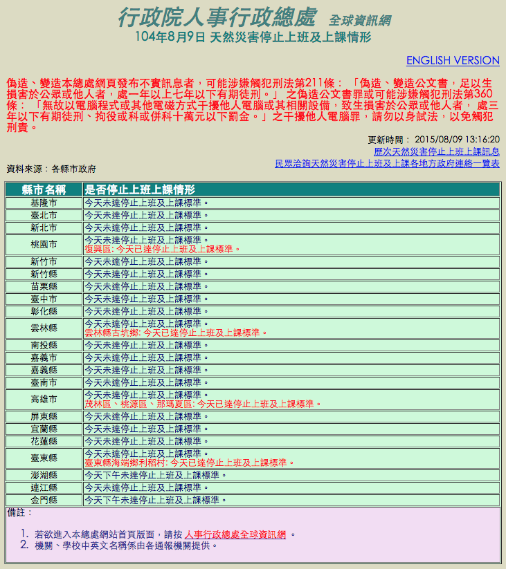 ⬅ 回看原文: [行政院] 停班停課公告網頁 (颱風假)
