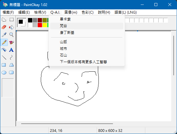 除了操作完全跟傳統小畫家一模模一樣樣之外,還多了一個很厲害的「Q-AI」功能,可以幫我們將原本的簡筆畫幻化成畢卡索、梵谷跟康定斯基… 等名家的風格。看起來還真的頗有藝術感。