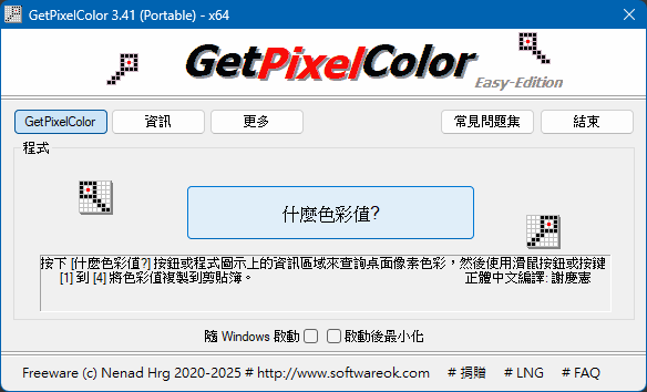執行 GetPixelColor 程式後,按一下「什麼色彩值?」按鈕,即可開始取色。