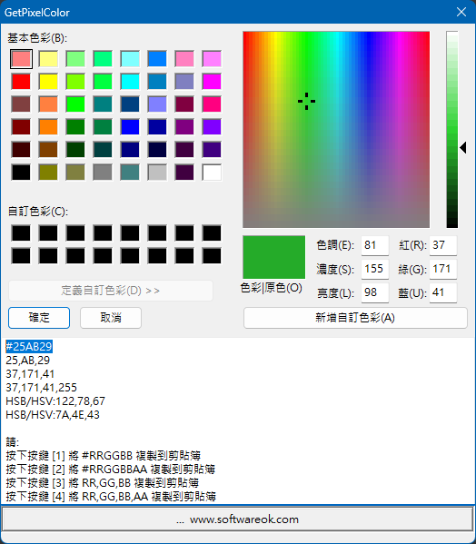 取色後,視窗下方會顯示各種格式的顏色代碼。