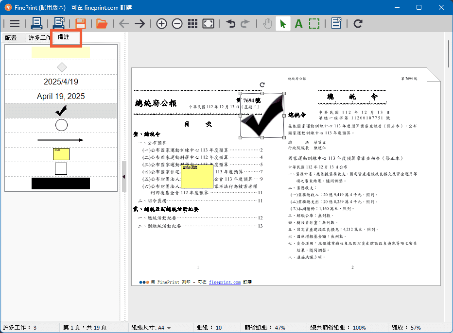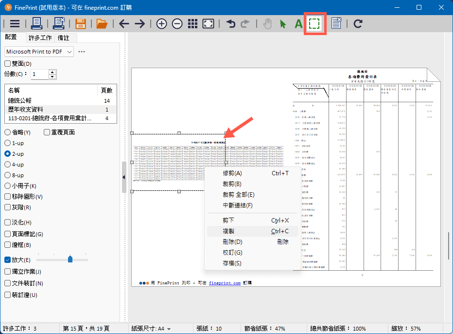FinePrint 提供相當完整精細的預覽列印功能,除了多頁、跨檔案合併列印之外,還能刪除不需要的頁面,甚至還能選取頁面中的區塊移動、合併到同一個頁面中,讓我們節省更多墨水或紙張。此外我們還可以選擇不列印圖檔、不列印某個區塊的圖檔,或將彩色頁面降為灰階、淡化列印濃度,讓我們省更多。