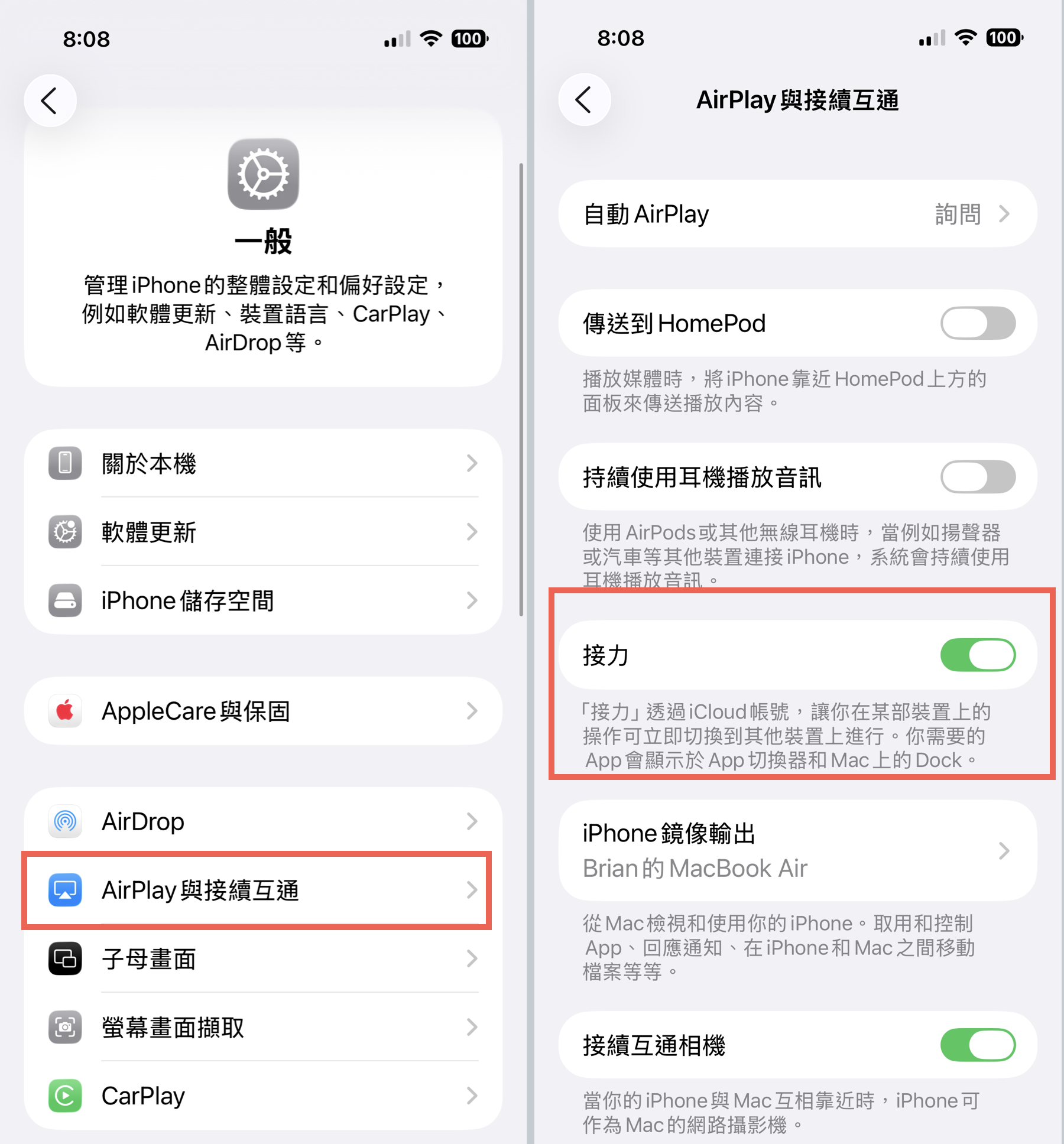 如果沒法使用,可以先去手機的「設定」→「一般」→「AirPlay 與接續互通」檢查「接力」功能有沒有啟用。