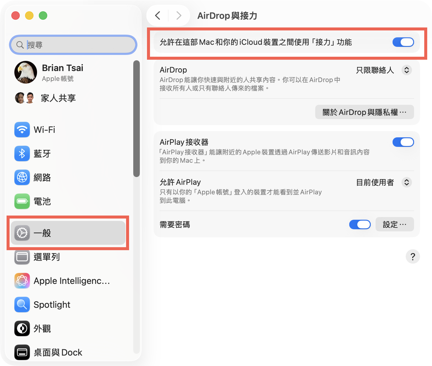 在 Mac 電腦裡面的話,則是在「設定」→「一般」→「AirDrop 與接力」裡面。