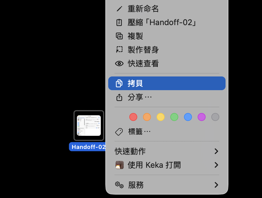 當你想要將 Mac 電腦裡的檔案拉到 iPhone 中的話,可以現在檔案上按滑鼠右鍵再點「拷貝」。