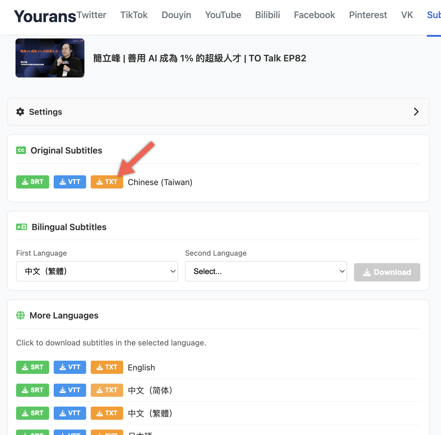 目前提供了 SRT、VTT 與 TXT 三種格式的字幕檔可供下載,TXT格式提供單純的語音轉文字的純文字內容,SRT、VTT 則包含了精確的 Timecode,可依實際需求選擇你要的格式來下載。